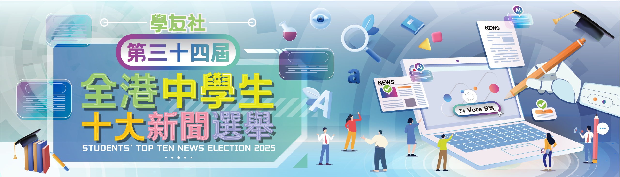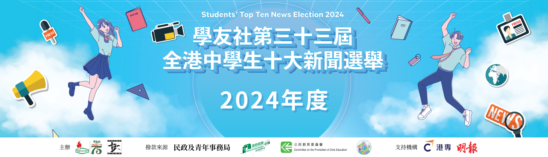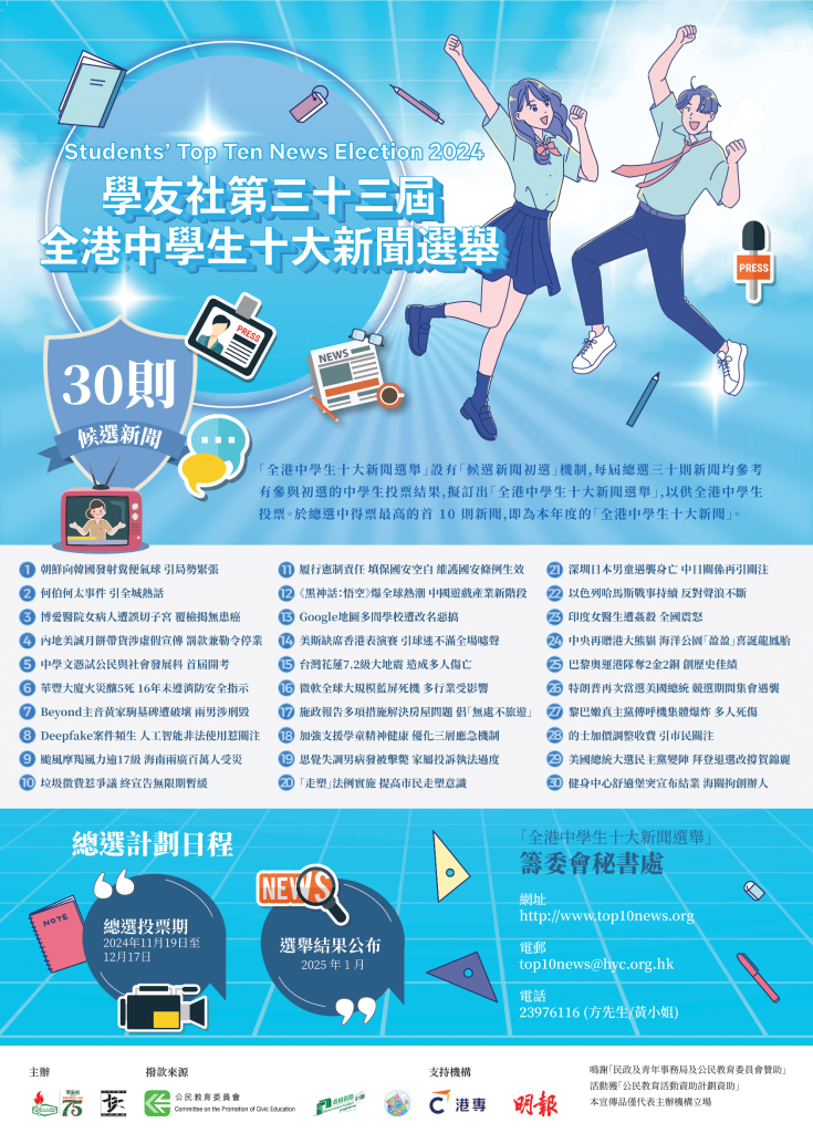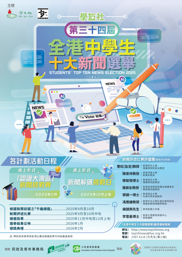 最新消息 See More 📢【第三十四屆全港中學生十大新聞選舉】即將開始~ 初選,大灣區,新聞挑戰賽,新聞評述,總選 活動1️⃣:候選新聞初選之「千編細選」活動 (2025年9月至10月) 截止報名 : 10/9‼️🔶由202... 【第三十三屆全港中學生十大新聞選舉】圓滿結束🥳 全港中學生十大新聞選舉,新聞評述 「第三十三屆全港中學生十大新聞選舉」早前已完滿舉行,其中新聞評述比賽的作品亦已輯錄成書,當中優秀作品更將陸續上... 【第三十三屆全港中學生十大新聞選舉】頒獎典禮🏅 十大新聞,得獎名單,總選,頒獎典禮 由學友社主辦的第三十三屆全港中學生十大新聞選舉頒獎典禮於2025年2月8日圓滿結束,當天出席包括學友社副主席... 🔥學友社2024年中學生十大新聞出爐🔥 特朗普再次當選美國總統居首 十大新聞,投票,總選,選舉 由學友社主辦、民政及青年事務局及公民教育委員會贊助的「第三十三屆全港中學生十大新聞選舉」早前已完滿舉行,共有... 📢【第三十三屆全港中學生十大新聞選舉】總選11月19日至12月17日展開❗ 30則新聞,投票,總選 1️⃣網站投票:📝學生投票網站(學校須事先報名及開設帳戶): HYC – Home (top10news.or... 12 新聞評述 See More Top10news 2024|Are Hong Kong athletes getting the treatment they deserve?︱Author︰Kwok Hei To Charlotte Top10news 2024|How Cultural Initiatives are Reviving Hong Kong︱Author︰Cheng Ka Wai Top10news 2024|Bamboo and Balance:The Economic Ecosystem of Giant Pandas︱Author︰Ching Ryann Top10news 2024|Uncertainties of the New Proposal of Differentiated Tuition Fees in Hong Kong Universities︱Author︰Siu Wing Yan Tiffany Top10news 2024|Mega Event Economy: Is it the panacea to save the declining economy?︱Author︰Wong Tin Lok 點擊顯示更多詳細資訊 點擊顯示更多詳細資訊